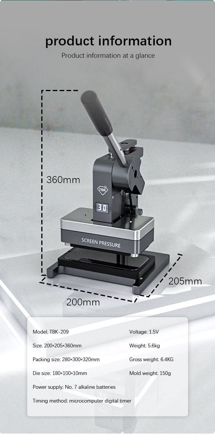 TBK 201C Pressure Jig Fixture for Mobile Phone Screen Pressing Mold. Machine size: 22*9.5*19cm Wooden box size: 27*17*27cm Product net weight: 2.2KG After packaging: 2.5KG..