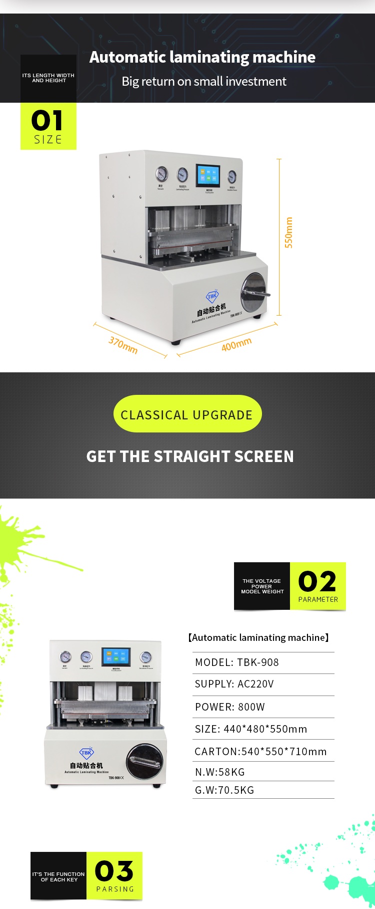 TBK 808A | All-in-One OCA Machine with Built-in Pump & Compressor. The TBK-808A is an all-in-one laminator and defoaming machine designed to streamline the screen repair process. It combines ..