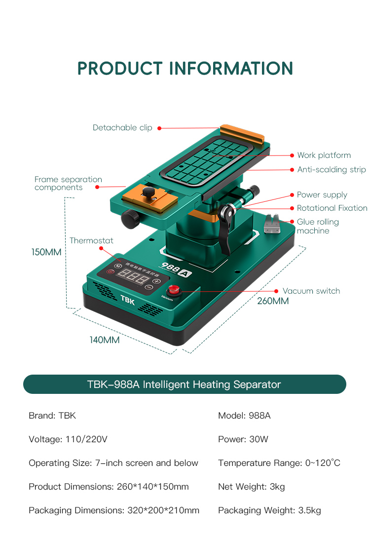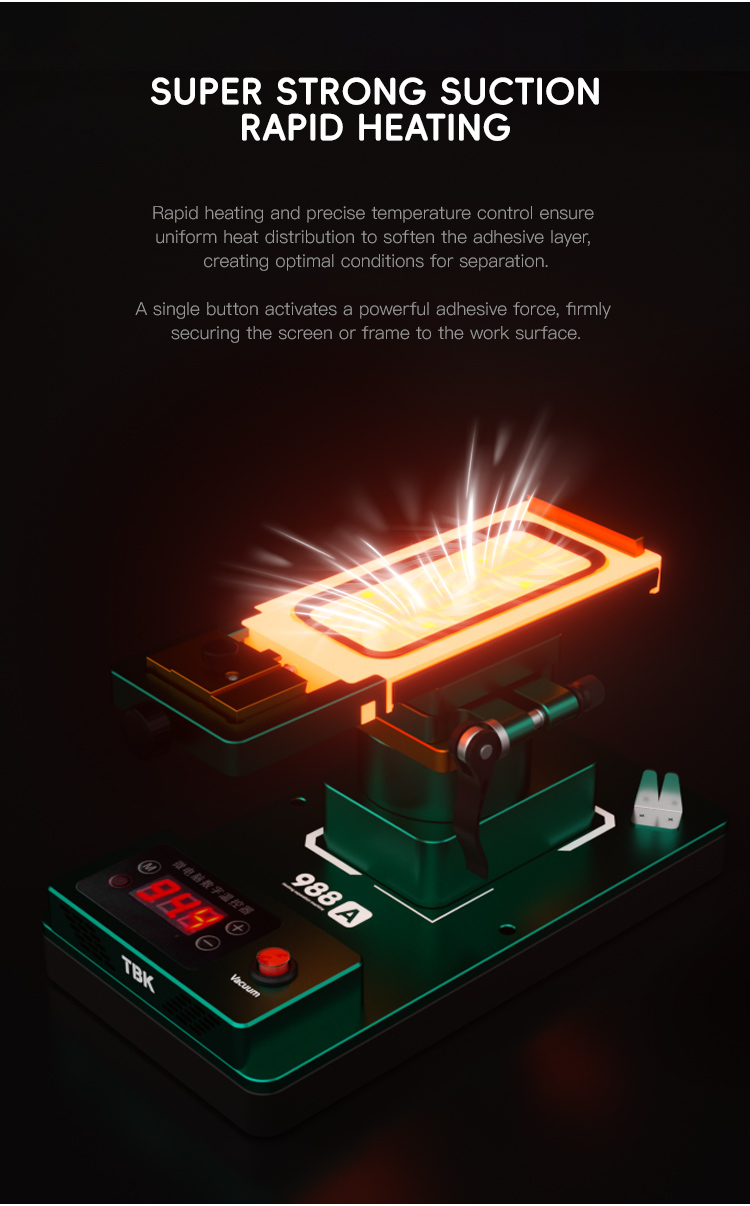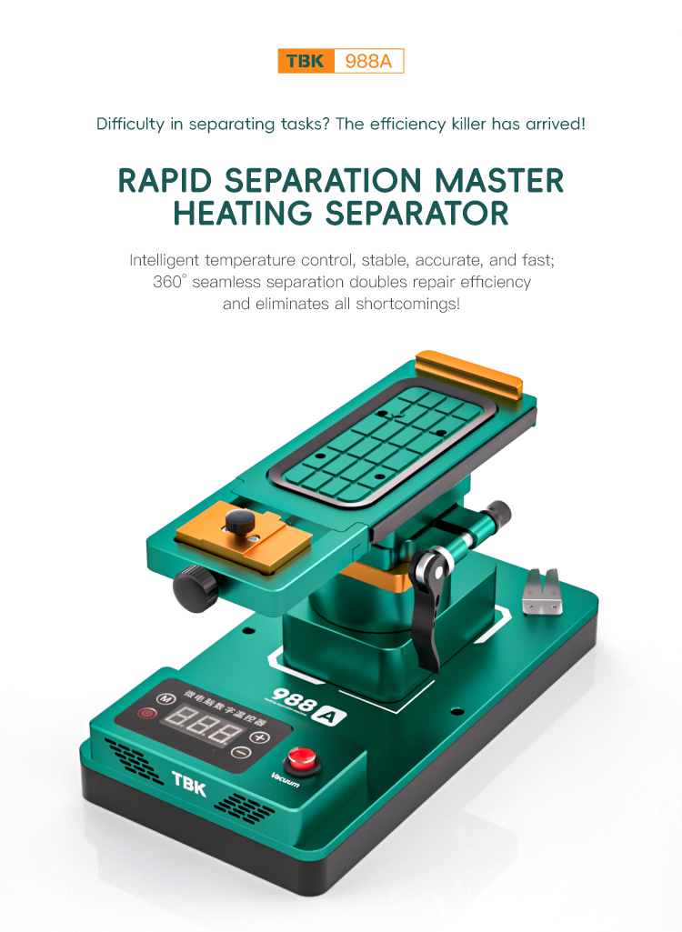 TBK 988C 360° Rotating Tilt LCD Screen Separator for Flat & Curved Screens. The TBK-988C is a multi-functional and easy-to-use LCD screen separator designed for mobile phone repair. It effici..